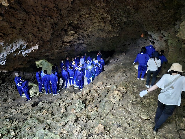 沖縄に到着してすぐに、山城本部壕(沖縄陸軍病院本部壕跡)に向かいました。ガイドさんの先導で壕(ガマ)の中を見学し、中では懐中電灯を消して暗闇体験も行いました。戦争の悲惨さ・愚かさと、平和の大切さ・有難さを実感しました。