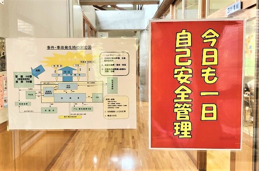 さて、校内のあちこちに、『今日も一日 自己安全管理』という言葉が掲げてあります。これは、“自分の安全は自分で守る”という意味を表しています。心に留めておいてほしい大切な言葉です。