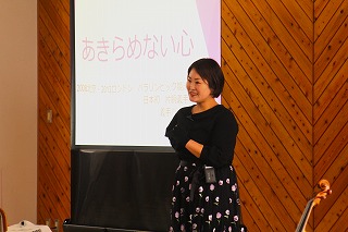 「あきらめない心」という演題で、バイオリニストであり、元パラリンピック水泳日本代表の伊藤真波さんに、ご講演をいただきました。20歳のときに交通事故に遭われ、右腕を切断された後も自分の夢を追い続け、日本初の義手看護師としての道を歩まれたこと。水泳のパラリンピック日本代表として、またバイオリン奏者として、そして、今は3児の母となり育児に奮闘しておられることなど、その壮絶な生き様をとても明るく語っていただきました。