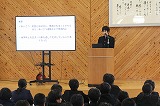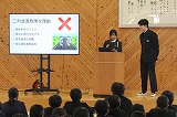 12月2日(火)、全校集会がありました。集会では、生徒会三役から、「すれちがいあいさつ」のふり返りと、美化安全委員会から、「二列並進の危険性」について講習がありました。